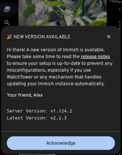 Here's another point of confusion: Immich thinks the server version is out of date because it's comparing the TrueNAS-reported version rather than the release version, but this may be more of a bug for the TrueNAS team.