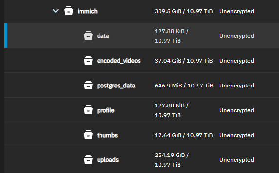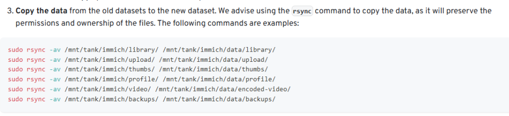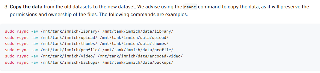 I followed the steps did ssh as root did rsync but running into below issue 2025-11-20 09:04:02.838598+00:00Starting api worker 2025-11-20 09:04:02.842852+00:00Starting microservices worker 2025-11-20 09:04:05.187836+00:00[32m[Nest] 7 - [39m11/20/2025, 1:04:05 AM [32m LOG[39m [33m[Microservices:WebsocketRepository][39m [32mInitialized websocket server[39m 2025-11-20 09:04:05.615130+00:00[32m[Nest] 7 - [39m11/20/2025, 1:04:05 AM [32m LOG[39m [33m[Microservices:DatabaseRepository][39m [32mtargetLists=1, current=1 for clip_index of 12501 rows[39m 2025-11-20 09:04:05.620225+00:00[32m[Nest] 7 - [39m11/20/2025, 1:04:05 AM [32m LOG[39m [33m[Microservices:DatabaseRepository][39m [32mtargetLists=1, current=1 for face_index of 18656 rows[39m 2025-11-20 09:04:05.742822+00:00[32m[Nest] 7 - [39m11/20/2025, 1:04:05 AM [32m LOG[39m [33m[Microservices:StorageService][39m [32mVerifying system mount folder checks, current state: {"mountChecks":{"thumbs":true,"upload":true,"backups":true,"library":true,"profile":true,"encoded-video":true}}[39m 2025-11-20 09:04:05.743417+00:00[31m[Nest] 7 - [39m11/20/2025, 1:04:05 AM [31m ERROR[39m [33m[Microservices:StorageService][39m [31mFailed to read (/data/encoded-video/.immich): Error: ENOENT: no such file or directory, open '/data/encoded-video/.immich'[39m 2025-11-20 09:04:05.752069+00:00[32m[Nest] 22 - [39m11/20/2025, 1:04:05 AM [32m LOG[39m [33m[Api:WebsocketRepository][39m [32mInitialized websocket server[39m 2025-11-20 09:04:05.768341+00:00microservices worker error: Error: Failed to read: "<UPLOAD_LOCATION>/encoded-video/.immich (/data/encoded-video/.immich) - Please see https://docs.immich.app/administration/system-integrity#folder-checks for more information.", stack: Error: Failed to read: "<UPLOAD_LOCATION>/encoded-video/.immich (/data/encoded-video/.immich) - Please see https://docs.immich.app/administration/system-integrity#folder-checks for more information." 2025-11-20 09:04:05.768410+00:00at StorageService.verifyReadAccess (/usr/src/app/server/dist/services/storage.service.js:129:19) 2025-11-20 09:04:05.768418+00:00at async /usr/src/app/server/dist/services/storage.service.js:56:21 2025-11-20 09:04:05.768424+00:00at async /usr/src/app/server/dist/repositories/database.repository.js:379:27 2025-11-20 09:04:05.768437+00:00at async /usr/src/app/server/node_modules/.pnpm/kysely@0.28.2/node_modules/kysely/dist/cjs/kysely.js:535:20 any advice any what I messed up. Thanks