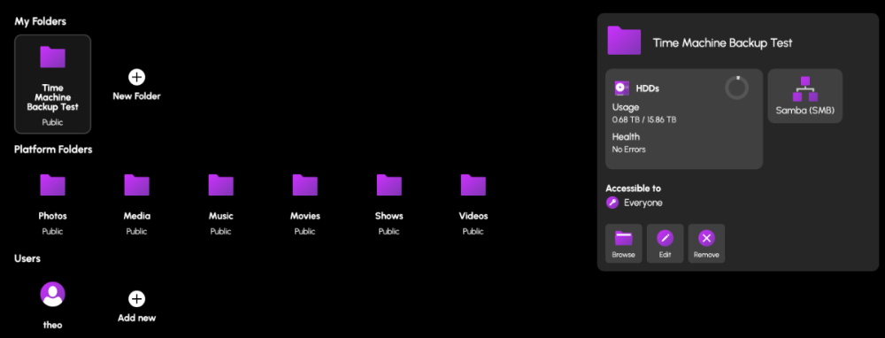 Hey all, similar to what TrueNas offers out of the box as the multi-user Time Machine option, I would like to see Time Machine Backup support for macOS devices. This could be a special type of folder for that special purpose only where settings are locked in and only user access permissions can be set as with any other folder. Hope to see this implemented at some point together with a quick tutorial on how to set up the backup in macOS with automatic drive connection on system start and so on. Would make the whole process of setting it up very easy for everyone. That feature would make HexOS a real alternative to the mac mini as a home server for "all-in on apple" people. Please feel free to ask for clarification and add your ideas!18 points
