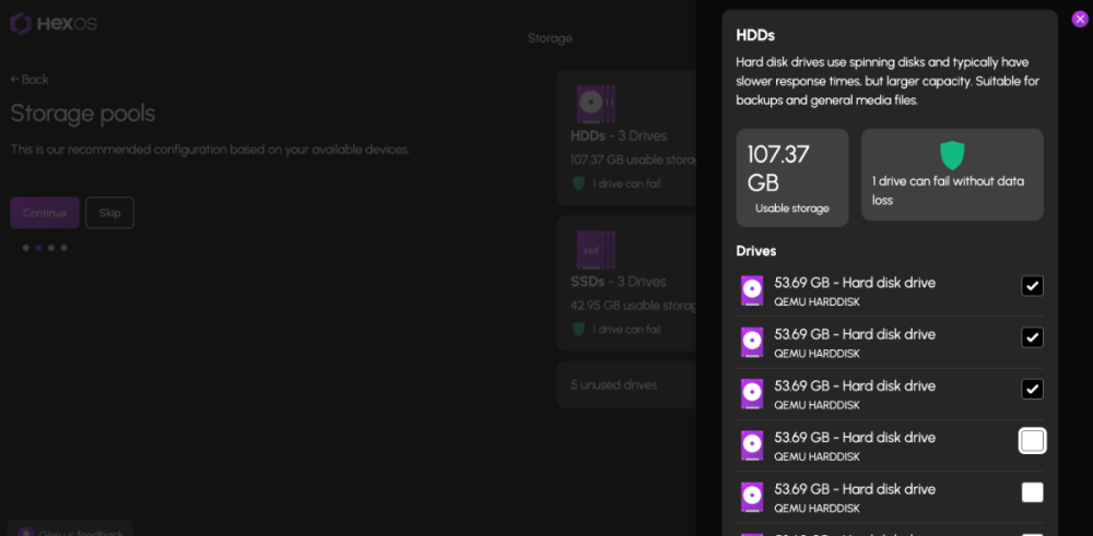 UPDATE: As of 11/8, we have updated the ISO installer to run on version 25.04.2.6 of TrueNAS SCALE. Existing users should NOT reinstall to get this version. You can update from within the Activity card on the Dashboard (or the Notification). Hello and thank you for joining the HexOS beta program! You are an elite and vital part of this project and your participation is greatly appreciated. This post contains all the information you will need to get started with HexOS and how to communicate with our team during your beta experience. Disclaimer Beta Products, Software, and any related Services are still in development, and therefore, you are advised to safeguard important data, to use caution, and not to rely in any way on the correct functioning or performance of the products, software, or any related services. Beta Products and Services are provided to you “AS IS”, without any warranty whatsoever. Expectations During your participation in the beta, we expect you to do the obvious: use and test the software. But we also expect you to communicate with us when things don’t go right or if you’re having trouble. Please post feedback and let us know about your experiences, good and bad. That being said, please remember that this is beta software and early access. HexOS has a long and healthy roadmap ahead. Quickstart Guide For those that just want to get started, here’s the TLDR: Download the ISO here: https://downloads.hexos.com/TrueNAS-SCALE-25.04.2.6-HexOS.iso or https://hexos-downloads.sfo3.cdn.digitaloceanspaces.com/TrueNAS-SCALE-25.04.2.6-HexOS.iso (SHA256 Checksum: e8ed99a322affe0969b82b866161a9f6acbc1561e3cc7b2efb2bf120ffe2e856) Use a tool such as Balena Etcher to image a USB flash device with the ISO. Boot your server from the flash device and install the OS to preferably an SSD. When given the option, opt to create the admin password in the installer (do not select the option to "Configure using WebUI"). Remove the flash device and reboot your server when the install is complete. From another device (mobile, tablet, desktop) that is on the same LAN as your server, login to https://deck.hexos.com using your HexOS credentials. Follow the instructions to complete your server configuration. NOTE: As of the 24.10.2.2 build of this ISO, configuring the admin password via the webUI option has been removed from the installer. However, if you select to create an admin password, but then attempt to "cancel" that process, the ISO will proceed with an installation with no admin password set. This is a known bug and the TrueNAS team will be addressing this in a future update to the ISO. Just don't cancel out of creating the admin password in the installer ;-). Hardware Requirements Booting HexOS is designed to support a wide variety of x86 hardware (Intel or AMD). The minimum requirements are a 2-core 64-bit CPU, 8GB of memory, and a 16GB or larger SSD boot device. However, depending on your needs for performance and applications, more resources may be required. Storage Pools Pools are made up of storage devices based on size and type (HDDs vs. SSDs). Storage devices in each pool need to be roughly the same size*. The OS boot device cannot be a part of a pool. Expandable pools require a minimum of 3 devices and can be grown one device at a time. Non-expandable pools can be created with 2 devices. Initial pool width should not exceed 8 devices. Maximum expanded pool width should not exceed 12 devices. At least one storage pool must be created to use HexOS. *In the event of slight variations (e.g. 240GB and 256GB), devices can be grouped, but total capacity for the pool will sacrifice the larger device’s excess storage. Build Recommendations HexOS has been designed so that a relatively modern PC can be easily transformed into a very viable home server. This means using standard HDDs/SSDs and using onboard controllers for storage/networking. However, since we’re based on TrueNAS, our hardware support is actually rather vast. For more detailed hardware recommendations for advanced builds, please refer to the TrueNAS SCALE Hardware Guide. Installing in a VM As HexOS is based on TrueNAS SCALE, it can be installed as a virtual machine as well. While the process should be fairly self-explanatory, please see the TrueNAS SCALE documentation for additional instructions on VM installation. Setup and Configuration Once the OS has been installed and rebooted, you will use a web browser on the same network as your server to register your system and complete the setup process. This can be a PC, tablet, or mobile device. Using a capable browser, login to https://deck.hexos.com. Beta 1 Features Our first release is focused on providing a streamlined user experience for setup and configuration and laying the framework for what’s to come. The main features of Beta 1 include: Setup and configuration wizard Configure your home server in minutes with ease. Analyze system health, with warnings for SMR HDDs. Auto-configure storage pools to safeguard against device failures. Securely manage your server remotely via Command Deck. Storage device management Detect error states and conditions and report through the dashboard Highlight individual storage devices and their respective faults Replace devices from storage pools due to failure or preventative maintenance Expand pools as little as one device at a time Folders and users Create and share folders over your local network. Easily manage permissions for secure access. Apps One-click deploy Immich as a personal photo library app. One-click deploy Plex as a home media server. Automatic folder creation for app storage. Dashboard / UI Access key statistics like CPU, memory, network, and storage usage at a glance. Monitor storage health and see alerts for errors or degraded pools. Manage multiple servers from a single, unified interface. Enjoy mobile-responsive design for effortless navigation on any device.203 points