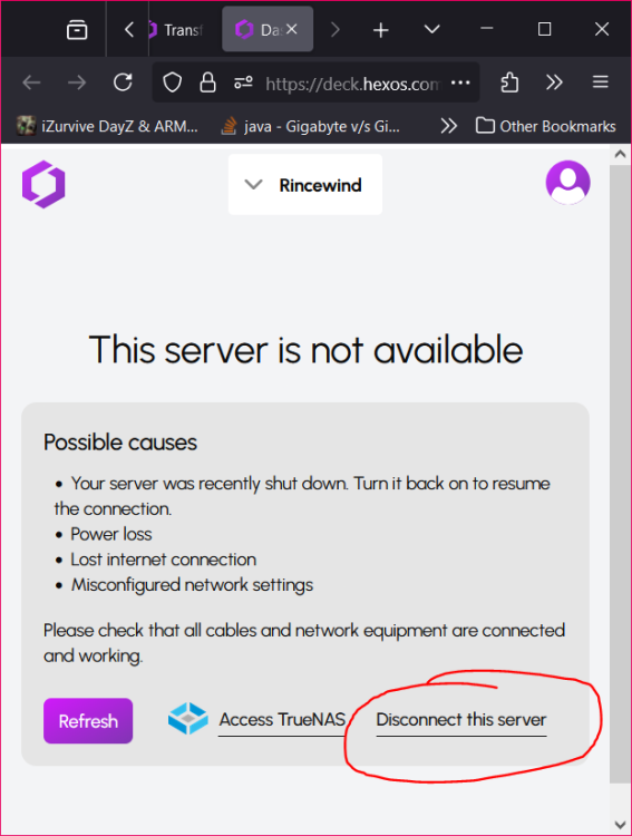Your "old" server does not have to be online to disconnect/ un-claim it. That server will show as offline on the command deck, and there is a button right there to disconnect. Like this: