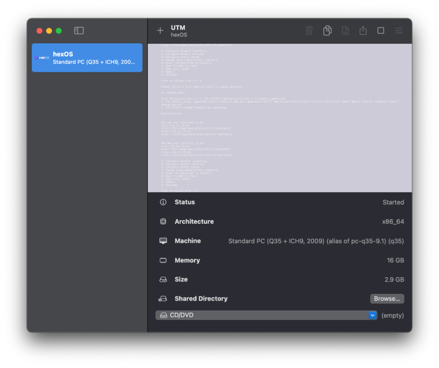 I successfully installed HexOS using UTM on macOS with an Apple M3 CPU (ARM). UTM, which is built on QEMU, allows you to emulate* a different architecture if you’re running something other than ARM. In this case, it was used to emulate x86_64, which is required for HexOS.