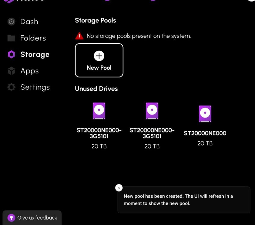 7. Hello, I am unable to create a Raid 5 on this dell optiplex 3020 I put 3 20tb ironwood pro drives in. I can create a mirror with the drives just fine no issues but that only uses two drives obviously. I've attached an picture to better understand the problem and show the complete error. The first picture is the regular boot and the second is the debug boot. I thought it might be the on board sata controller but I get the same error with a sata pcie card. Ive checked the bios and all three drives are detected in hexos