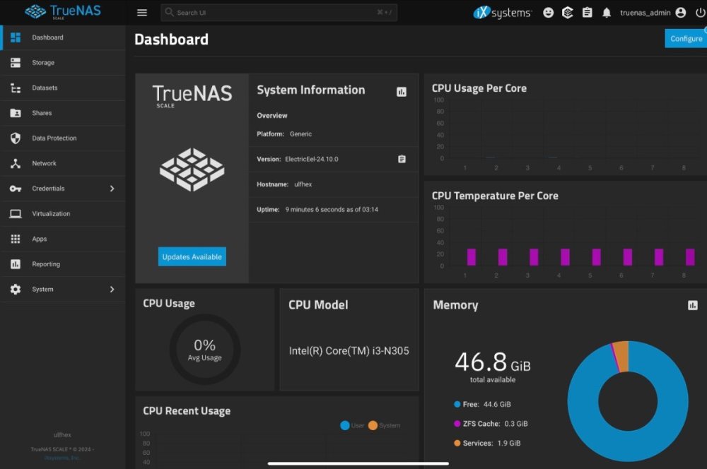 You know, for now it sits there really doing nothing, temperature is very moderate and no noise. I explained in an earlier post about the questions I still have, that makes me a bit paralyzed, for lack of a better word, when it comes to testing the PocketNAS for real. ”It’s apparent I’ve taken a little break from the HexOS implementation. It’s just that many questions are up in the air, a situation which don’t help me going forward. By writing them down here I try to make the road ahead a little smoother. It makes me being able to focus on one problem at a time. I hope. So here we go: Smb shares possible without installing anything? Separate pool for smb shares? (correct zfs terminology?) Getting my main Windows PC going, for smb shares Delete TrueNAS_admin account, and create another administrator user? Static IP (realized by DHCP reservations?) Https instead of http?” When I’m there, all question marks straightened and NAS is working moving my model files, I’ll let you know more.