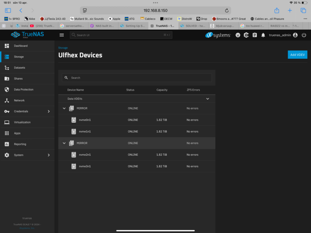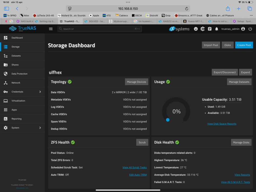 So, when I did it the correct way it looked this in TrueNAS interface. Now, remember I’m not the expert here. I rely on other knowledgeable persons. If what I’m doing is completely wrong, I hope someone will tell me 😉 Anyway, I’m not doing all this with critical data. For now I’m only playing a little. I would only work with disposable files at this stage. I still need to catch up on static IP address for the server, and other things, like backup of OS disk and storage. Life is fun 😉