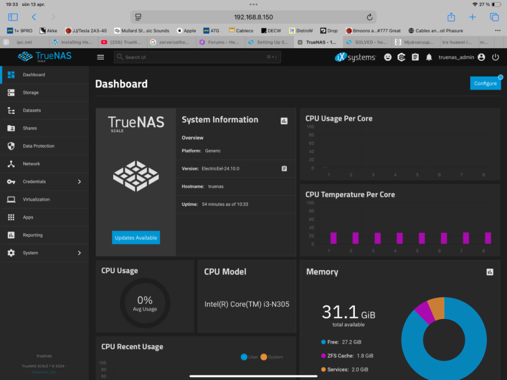Here’s the TrueNAS dashboard with respectable CPU temperatures, though my NVMe drives aren’t working much yet. When they are fully engaged temperature might rise.