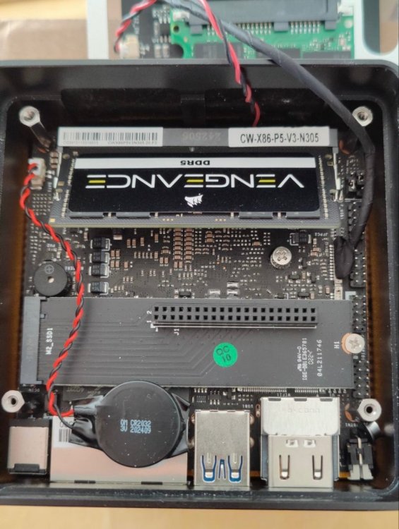 Just one thing I forgot to mention earlier. My SSD chip should be connected to SATA 2 or SATA 3 on the motherboard, according to ipc.net support (Jessica Fang). The one I used, the more easily available is SATA 3 to the middle right in this photo, with the black connector and cable visible. You can also see half of another SATA port just below in the photo, with the other half hidden under the board above it.