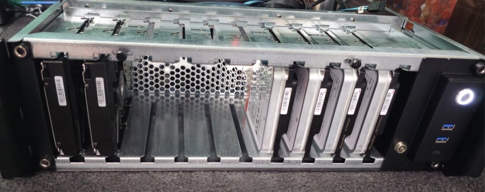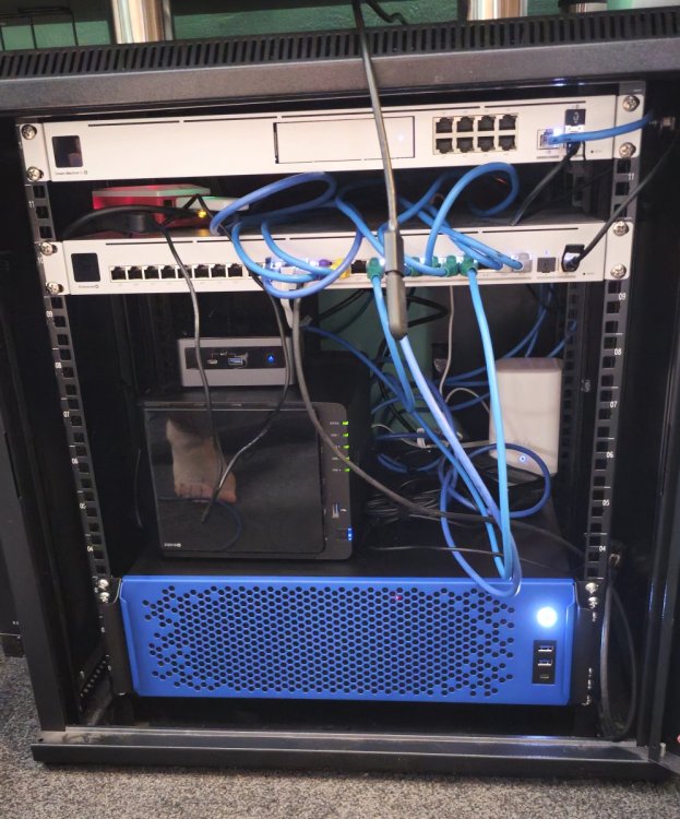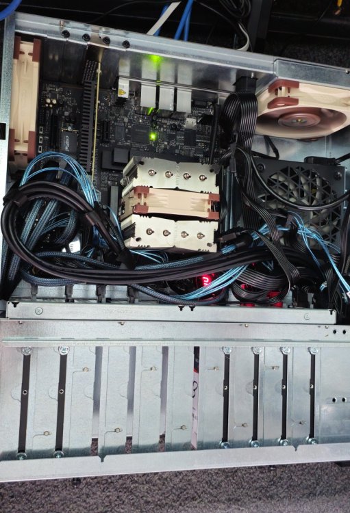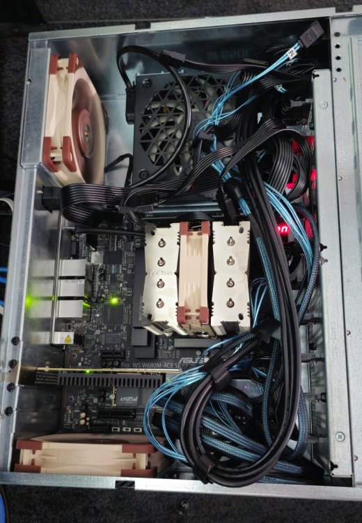 I had to open my NAS up to put some new 2.5" SSDs in it for my LANCache to run on as it had just been running on my HDDs as a test, so I figured what better time than now to take some photos and do a post? Specs: Case - Sliger CX3702 Motherboard - Asus Pro W680M-ACE SE CPU - Intel 14600k Cooler - Noctua NH-D9L RAM - 2x Kingston 32gb ECC DDR5 HBA - LSI 9400-16i Power Supply - Corsair 850W SF850L HDDs - 2x 4tb Ironwolf Pro, 2x 16tb Ironwolf Pro, 2x 18tb Ironwolf Pro SSDs - 1x 128gb 2.5" Samsung Boot Drive (This is an old SSD that I used to have in a PC?) - 2x 2tb NVME Drives - 2x 2tb 2.5" SSDs Notes for people in future - If your rack is 18" deep and the server is 17.72", you won't have room for cables, so I needed to get some tin snips and cut a hole in the back of my rack so that ethernet and power would fit.. But then I used tape so it wasn't sharp on the cables! (Also, I promise I vacuumed those spider webs...) Looks just like a bought one! Here's a photo before I tidied my rack, still has the old Synology on top of the new NAS before I transferred all my data. I'll add another photo after I get everything back in the rack, I have tidied things up a lot since then Other items in the rack: Synology DS916+ (Replaced with this new NAS) Intel NUC (Runs my Plex server until HexOS supports intel GPU passthrough) Eufy Homebase (For my doorbell) Raspberry Pi 4 running HomeAssistant (Only until HexOS official VM support comes!) Unifi UDM-SE Unifi 24Port Pro switch