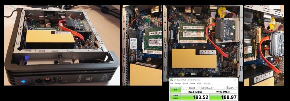On the bench today I have an old VXL Itona, rocking an AMD A4-5000 (1.5GHz quad core) and 8GB DDR3-1600. Booting from a 32GB SATA SSD Storage pool (for test purposes): 128GB (FGFF) mSATA SSD 128GB M.2 SSD (via PCIe to M.2 adapter board). Optional: 2.5GbE (NGFF) mPCIE card. Power consumption as measured form the outlet: Idle - 11W Load - 24W (Writing @ 1.5Gbps) Network performance was limited to 1.5Gbps by the BIOS being locked down to PCIe Gen1. I appreciate that this is not optimal and could probably be done better, but it was made from spare parts and all fits inside the case...