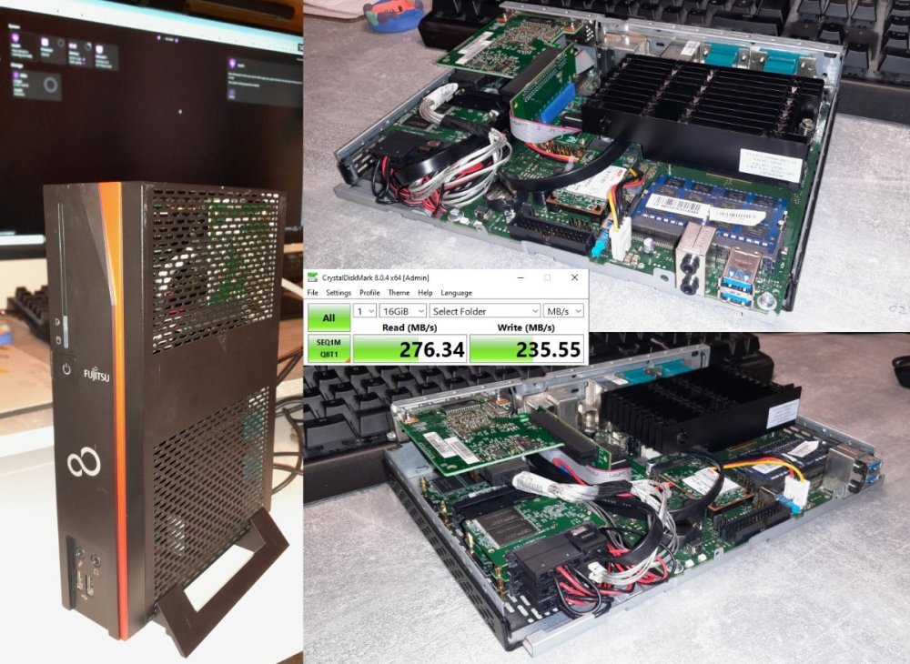 On the bench today I have an old Fujitsu Futro S930, running an AMD GX-424CC (2.4GHz quad core) and 16GB DDR3-1600. Boot pool is an mSATA SSD on the board and a SATA SSD in the 'expansion bay' area, both directly connected to the SOC via the motherboard headers. Storage pool is 4 x SATA SSDs also in the 'expansion bay' under the PCIE riser. HBA (connected to PCIE riser) is a 81Y4494 4-channel SATA 'IT mode' card. 2.5GbE (NGFF) mPCIE card. Power consumption as measured from the outlet: Idle - 15W Load - 32W (Writing @ 2Gbps) Challenges with this one: 1 - Manual BIOS modification required to change the PCIE speed (for NIC and HBA) from gen1 to gen2. For more info, check out this link: https://www.reddit.com/r/homelab/comments/1d722m5/first_homelab_fujitsu_futro_s920/?rdt=65533 2 - Not a lot of space so the SSDs had to be removed from their 'housing' and stacked on m2 pillars (like motherboard standoffs but smaller...) 3 - Powering the SSDs; I had to make up a custom cable for this, splitting off from the ATX header (uses same connector as a FDD) on the motherboard. I cut and soldered together a FDD power cable from a scrap PSU, and some USB Header to SATA cables like these: https://www.ebay.co.uk/itm/205143130740?var=505859057128 I'm currently testing Plex with no issues so far, it's happy trans-coding a 4K BD-'backup' to my phone while also streaming other media to a couple of clients, while being hit with Crystal Disk Mark at the same time. When streaming DVD-'Backups' to 2 clients the power consumption settled down to just 17W. This box is fanless and completely silent, but it needs to be stood on it's end to encourage enough natural convection through it's internals. In particular I noted that the PCIE SATA card gets rather warm, like many others I've seen it's designed to be fitted in a conventional server with quite aggressive case/chassis cooling.