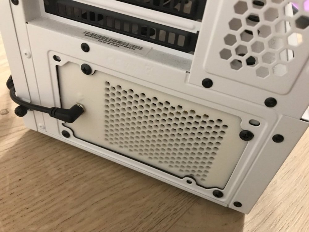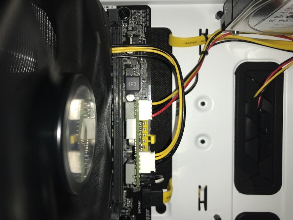 Power consumption is low, and regular ATX power supplies are less efficient in low power. The PSU’s designed for low power available are no-brand cheap crap that I don’t trust. So I went for a pico-psu with external 12 V power brick. The PSU is mounted directly in the ATX24p header.