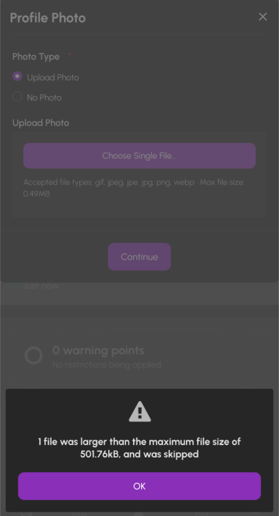 I keep trying to add a profile picture to my account, it says the max size for a file is 0.49MB and my pfp is 724kB but whenever I try to upload it, it hits me with "1 file was larger than the maximum file size of 501.76kB, and was skipped" issue is on mobile and desktop for me.