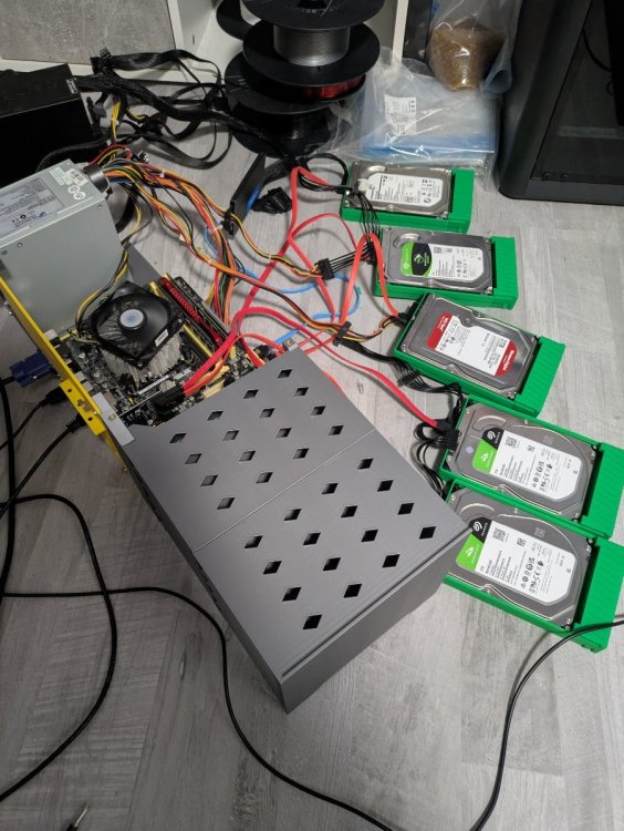 1. Man, I just had the worst time setting up the OS. TLDR: A corrupted drive can cause strange problems. And so can messing with the TrueNas interface. So I have a variety of old 2TB drives I wanted to put to good use. The oldest of which is from 2013 (out of my first PC) and has basically been in use constantly since then. Well, I have also known it to still work since I had it installed in my main rig up to a few days ago. Well, I also had a few strange and unexplained oddities with my pc. For example an unexplained second Windows installation on that drive despite it not having been a boot drive since about 2017. The only problem that caused, was a "select windows" screen after the boot screen. This screen survived MULTIPLE formattings and two different new boot drives, so I gave up on fixing that and lived with it. Now after that backstory to the relevant part. After I spent a day combining some old parts into something working I started installing Hex OS today. At first, everything went fine (except for having secure boot on) and after following the guide everything worked. Almost. I have even installed and tested Plex at this point. Now I wanted to see what would happen if one of the HDDs broke. so first I have a look at the storage tab and I see something weird. An unused drive. But I had selected 5 of 5 drives in the setup. it also told me I have 8TB of storage. so why does it show an extra drive? Well, in the details, I see that four of the five have a name and show me a serial number, like the extra one, but one was different. It only showed a long number and no details. weird. So I did the sensible thing and restarted. And oh no, now it shows my array as degraded, and there is still the extra drive. I tried replacing the number drive with the extra one. no luck. (but it still showed a success popup?) At that point, I resigned myself to messing with TrueNAS directly. but nothing worked. that was until I connected each drive individually and totally erased them. Whatever strange thing happened to the drive only went away after that. But this is not where this story ends of course. No, because I seemed to have messed with TrueNAS enough to cause Hex OS to have problems. setting up the now empty array worked fine. on to instaling Plex. It created the folders as bevor and then nothing. no working web interface. it did not even show as installed in TrueNAS. Welp, time to use the nice Reset and restore button. That will fix everything I think. So I wipe everything and wait.... and wait some more. but nothing happens. even after 15 minutes. the console on the server's display shows no changes. It does not show up in the dashboard. No rebooting. nothing. I try to log into TrueNAS. It needs a new password. Well, so this install is done. Back to square one. Fresh install from Boot USB. The array is fine now. Plex installes. IT FINALLY WORKS. Man, I bought Hex OS exactly to have it easy, but well, that's beta software ¯\_(ツ)_/¯ still better than pure TrueNAS. Sorry for the long rant but I got a little annoyed about all this and wanted to share the strange behavior of the array, the Whipe Everything function, and maybe even the problem with reinstalling the same app after having deleted the array. Also here's a work-in-progress picture of my 3D Printed 10-bay Micro atx Nas.