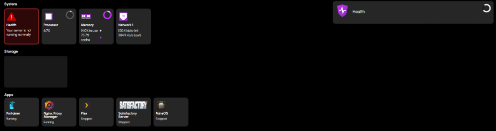 I wanted to add a single SSD pool to my system but HexOS wont let you create a pool without at least two drives so I had to do that manually in truenas. Hopefully there are plans to allow having a single drive pool? After adding my single SSD pool in truenas the HexOS UI seems to be broken. I will attach a picture of what I am seeing. It now shows my server health is not running normally and when I click on it to see what the problem is it just tries to load endlessly and never shows me. Also my original storage pool now no longer shows up under the storage list on the main page and under the storage page it says there are no storage pools present on the system. My system is running completely normal and truenas doesn't show any issues with anything. Just wanted to report these issues incase there may be a solution or if it would help the devs out in any way. Thanks and cant wait for 1.0!