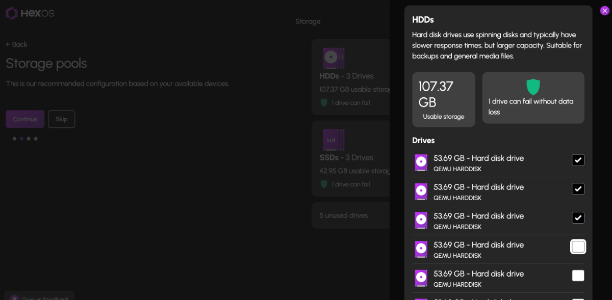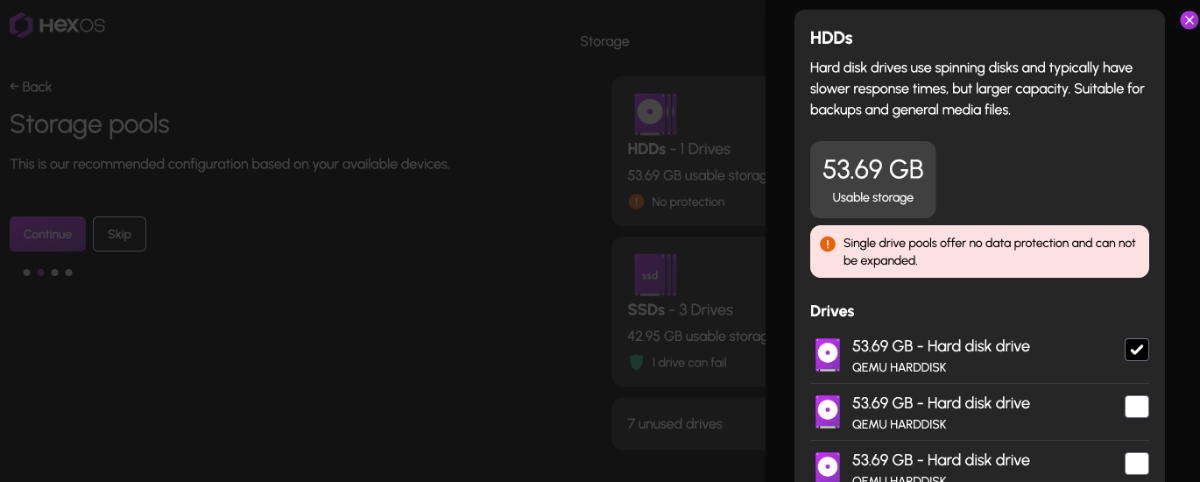 jonp Posted June 23 Author Posted June 23 Weekend testing went great! Documented a handful of bugs/issues that the team is actively squashing this week. Still hoping to publish the release by Friday, but we reserve the right to postpone till Monday if necessary. Here's a sneak peak at pool customization (drive selection) in the wizard: You'll notice in the background next to the "Continue" button that we have the option to "Skip" now! This will let users get into the dashboard without configuring any storage pools. This will enable the ability to adopt existing pools from TrueNAS SCALE itself (and other platforms). 9 4
